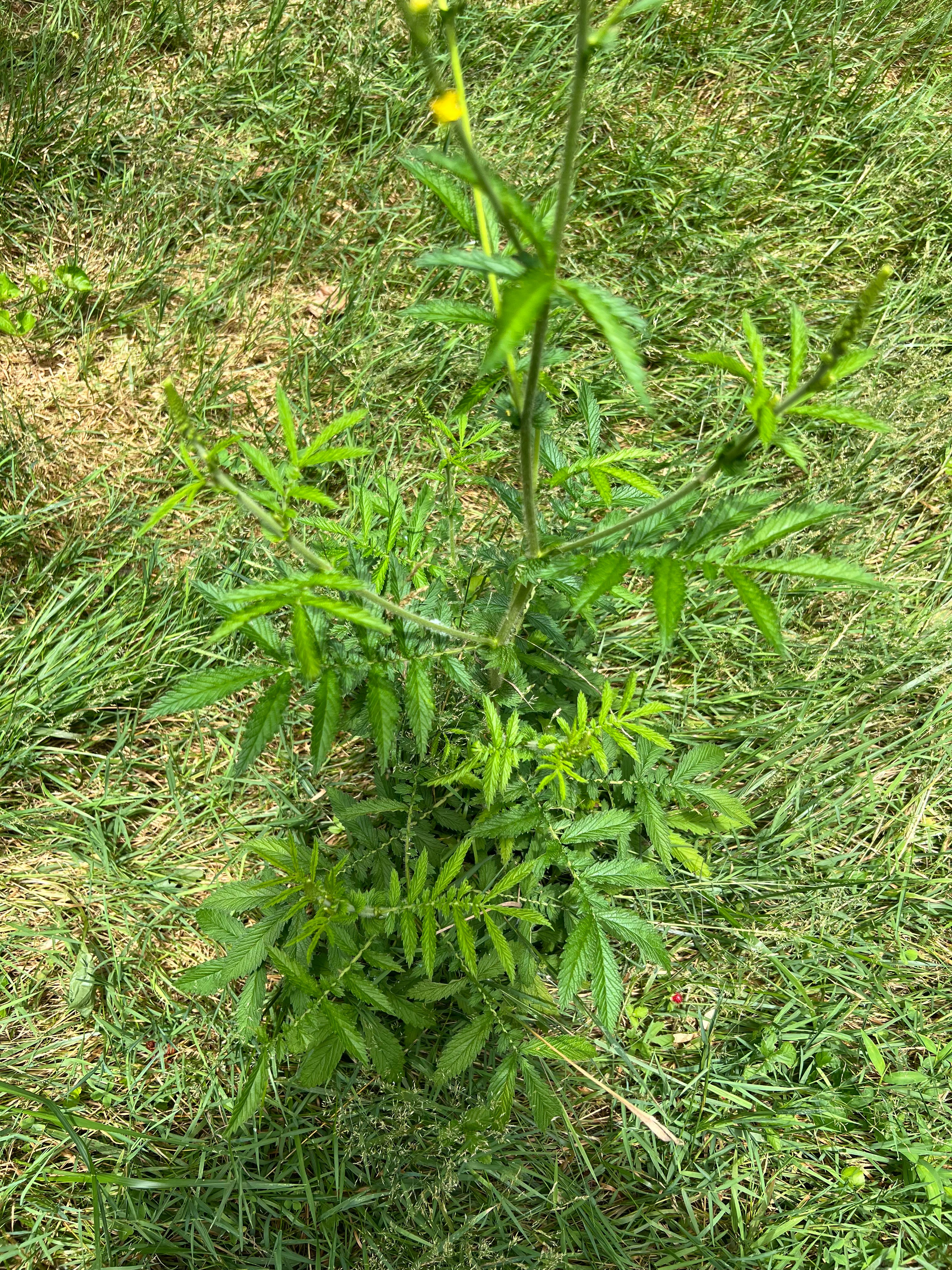 Native swamp agrimony (Agrimonia gryposepala) begins to bloom off the hill meadow path: