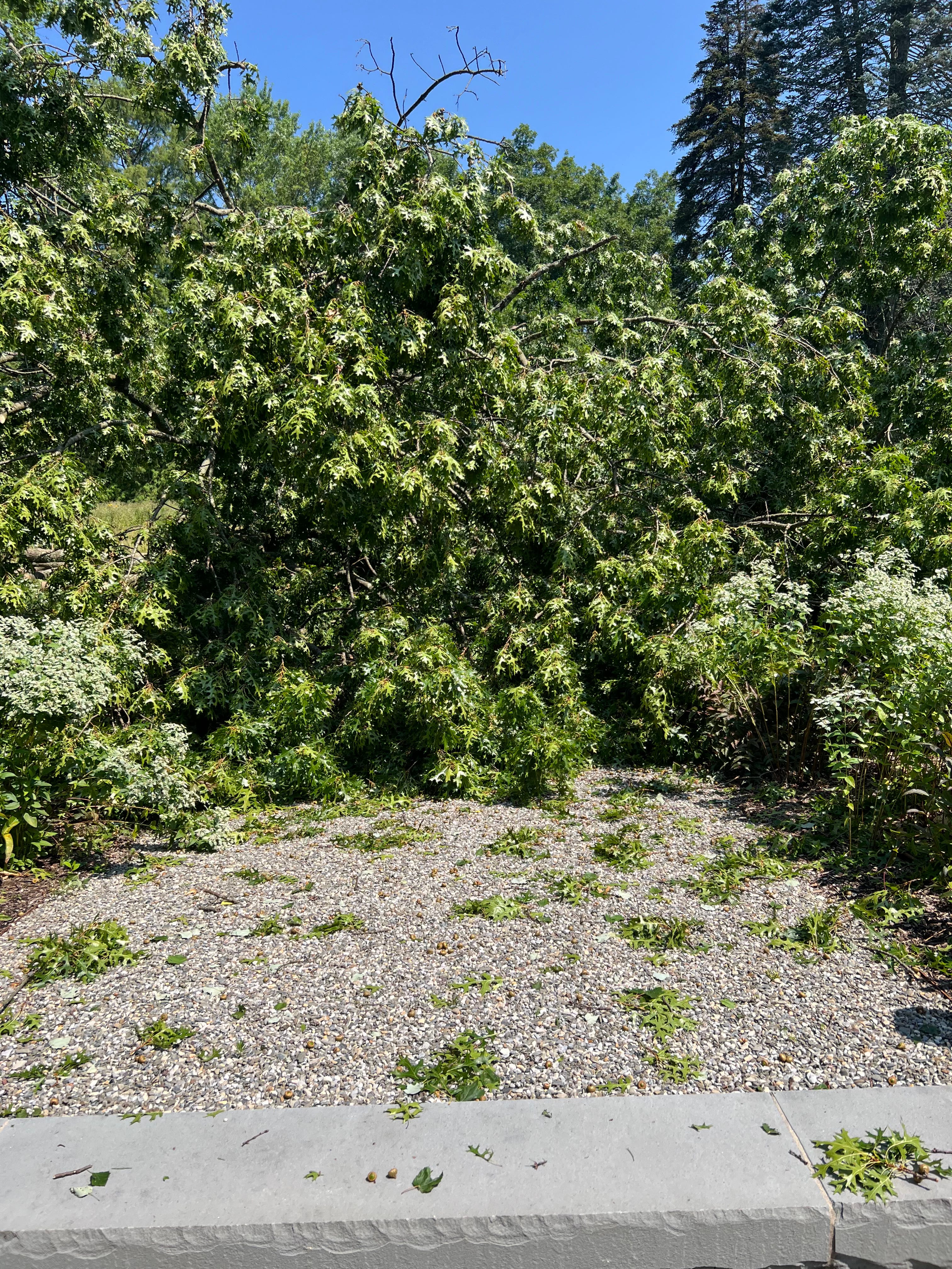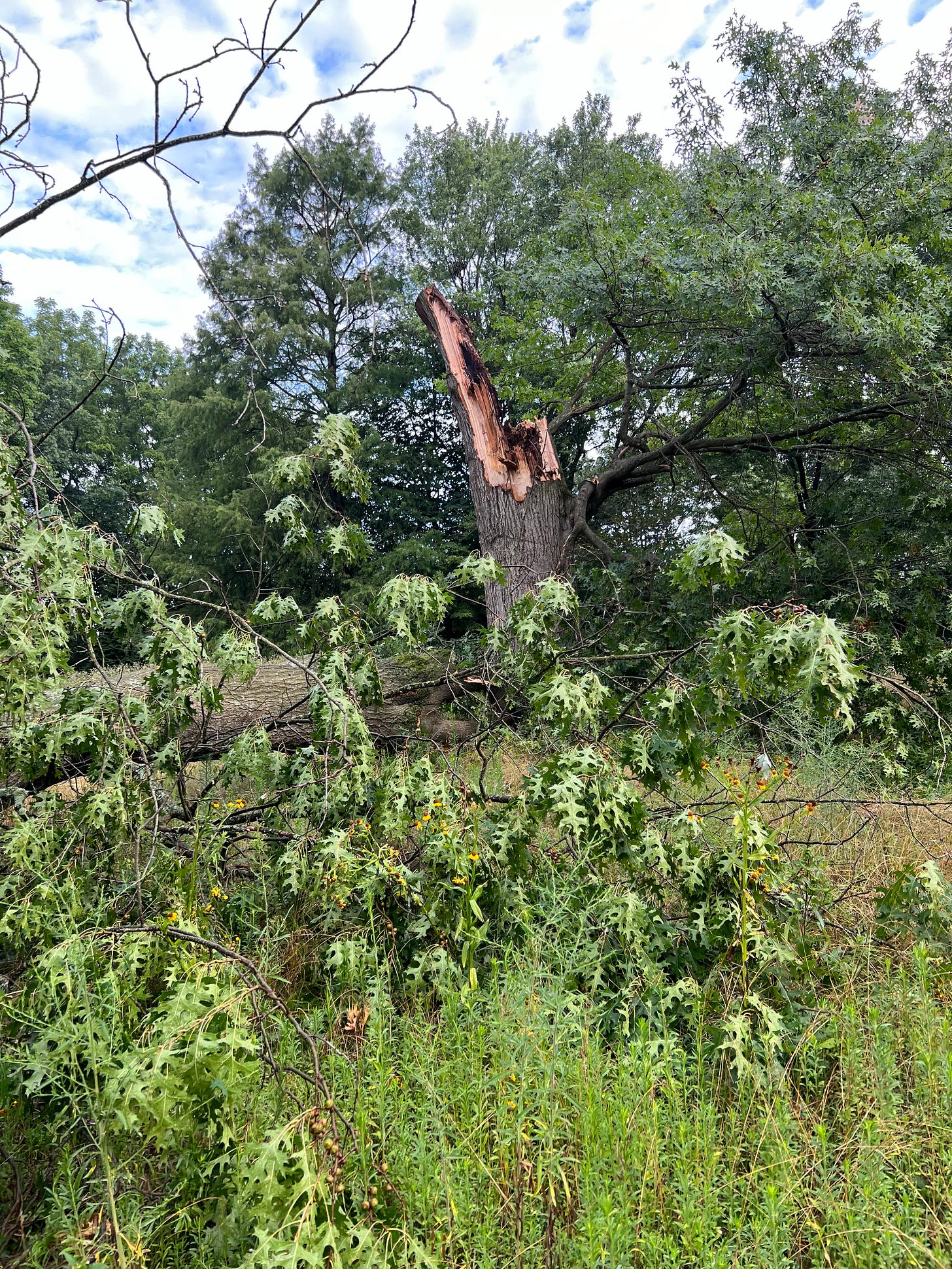 I have planted hundreds of trees over the past few years, most of which are on their own among the winds of fortune. The falling oak sheared off the limb of a mature maple tree that will never be the same. It crushed nearly the entire upper half of the patio garden—all native pollinators.