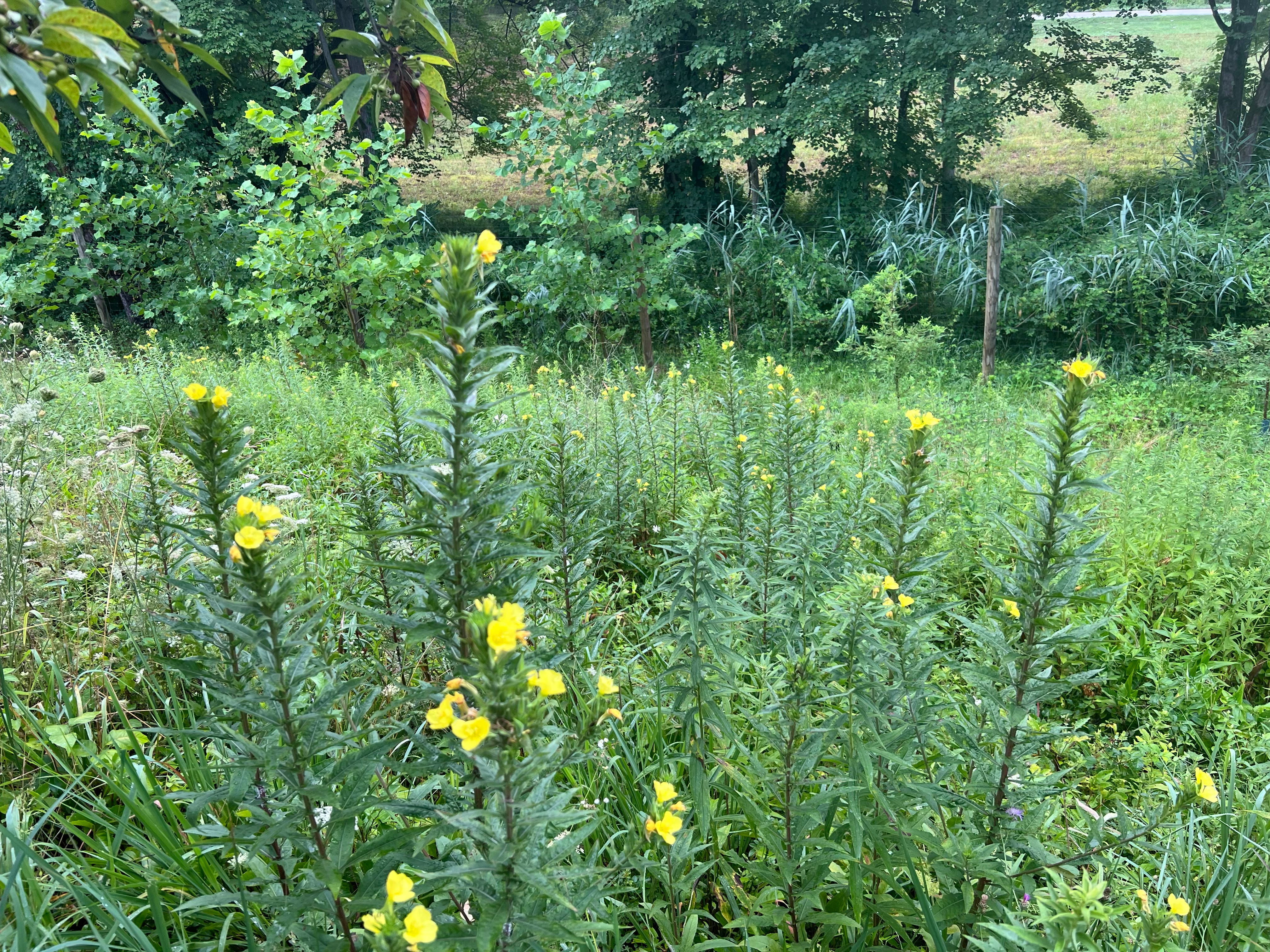 Native common evening primrose (Oenothera biennis) blooms on the portion of the big pond embankment we didn’t have to mow down for invasives: