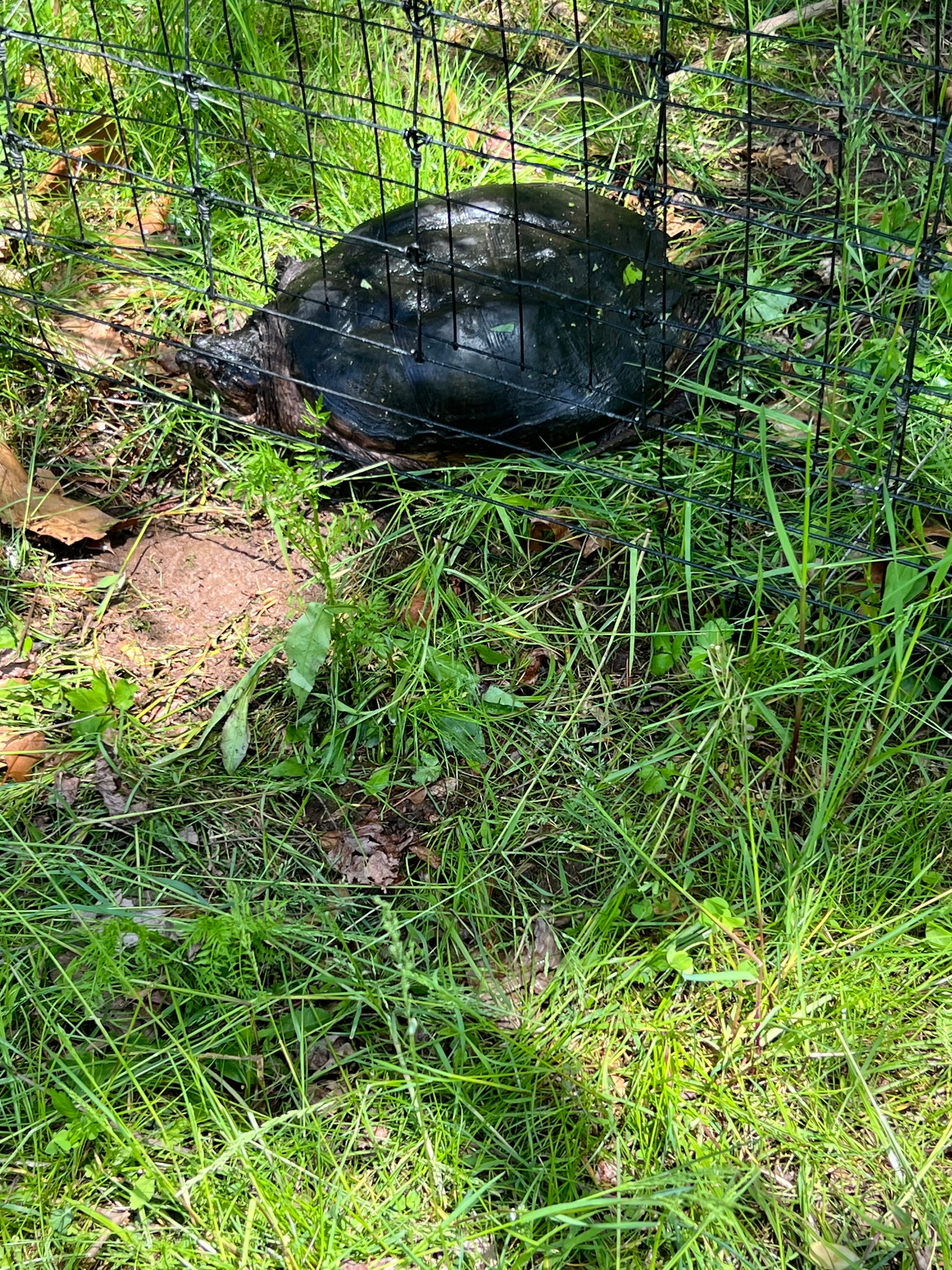 While out and about a few days later, one of the dogs started barking incessantly. When I investigated, I found a medium-size snapping turtle attempting without luck to shimmy under the fence: