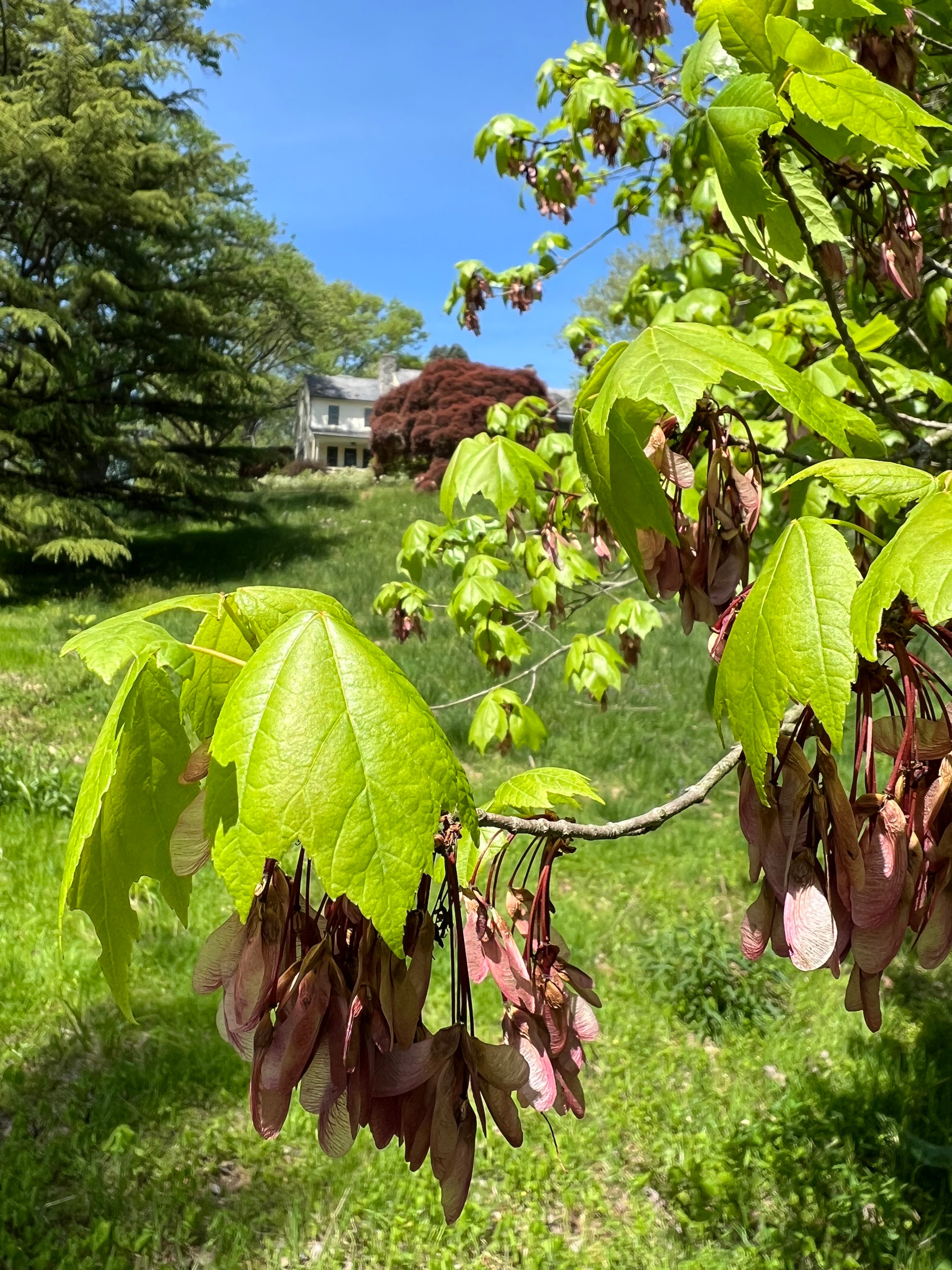 Seeds hang heavy on a native red maple (Acer rubrum) by the big pond (looking up to the house):