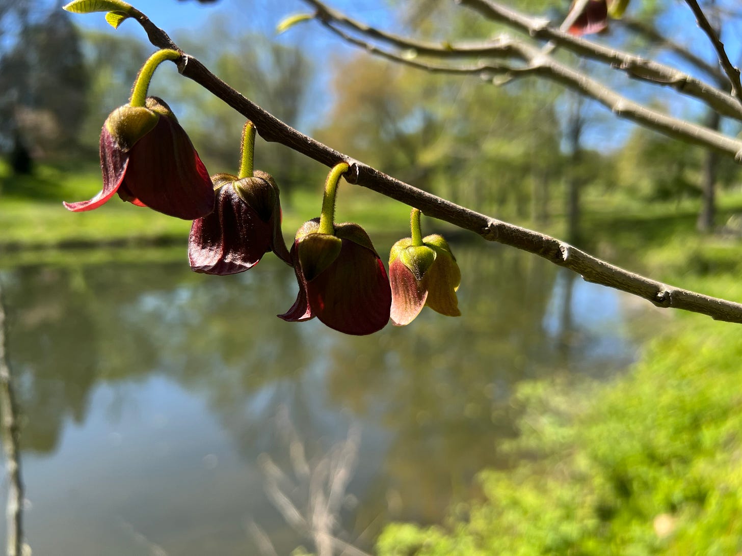 Flowers of native pawpaw (Asimina triloba) by the small pond seem otherworldly: