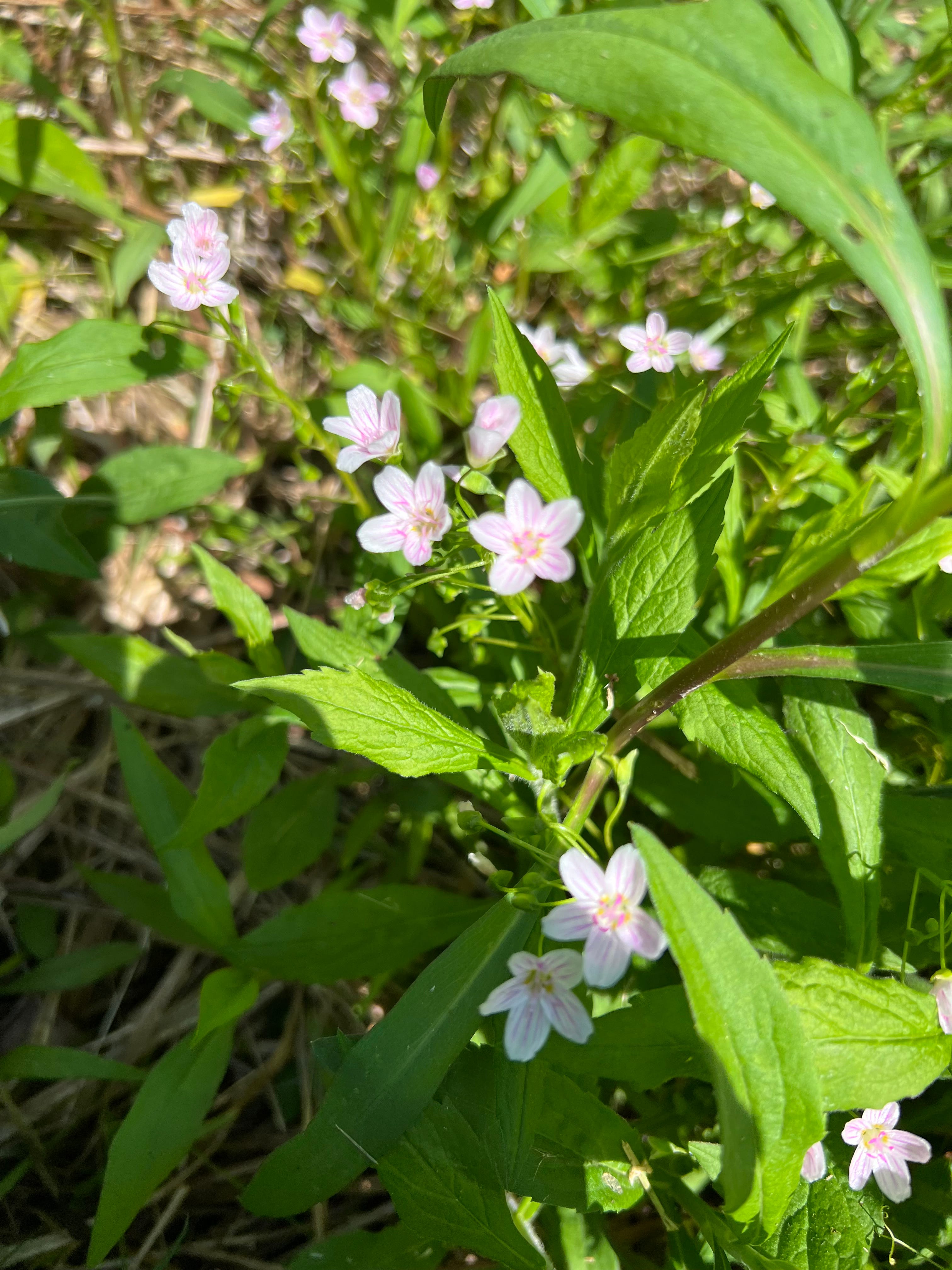 Virginia springbeauty (Claytonia virginica) plants flower between the barn meadow and the wet woods: