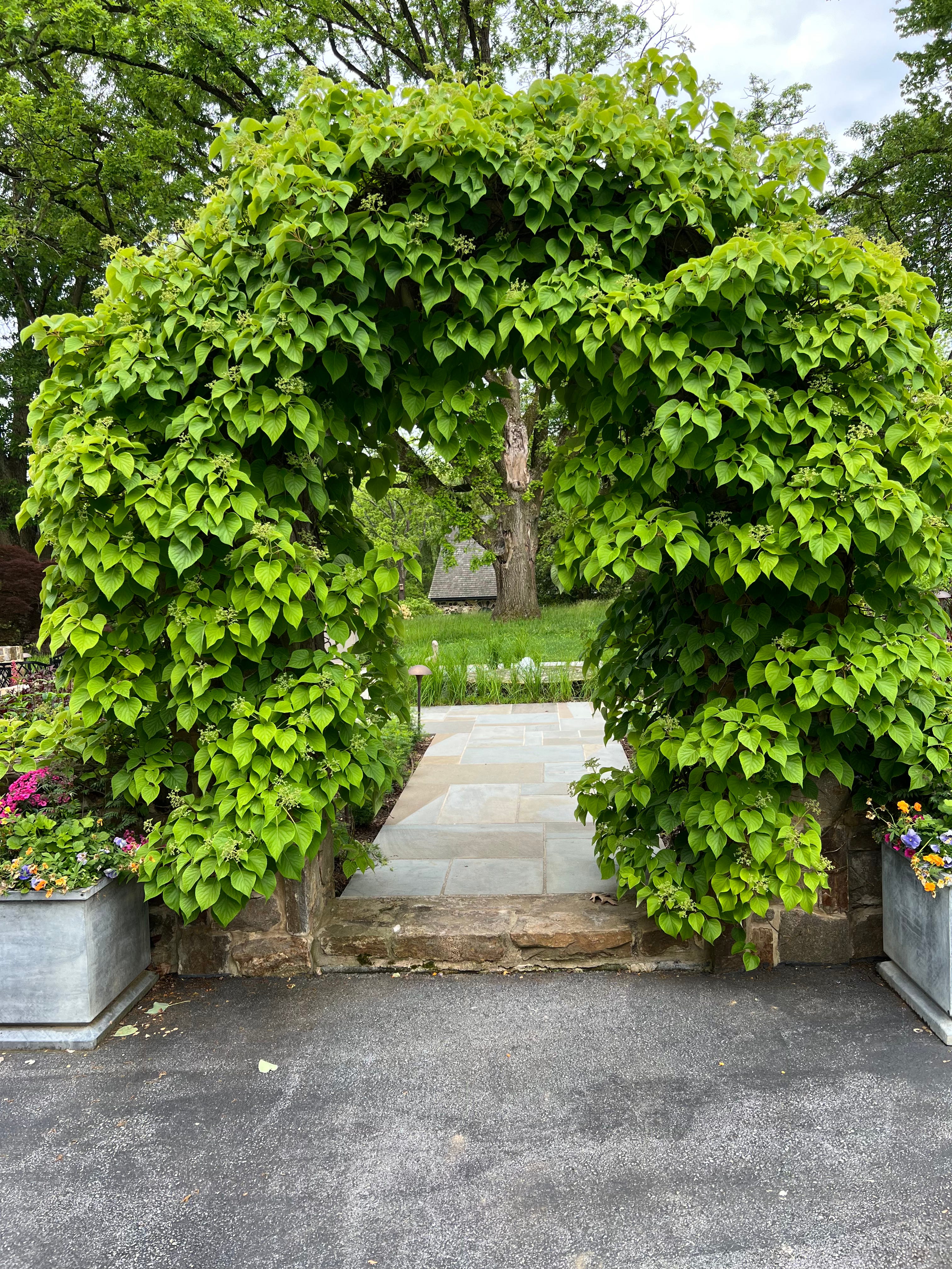 Non-native climbing hydrangea hangs lush on the patio garden arch: